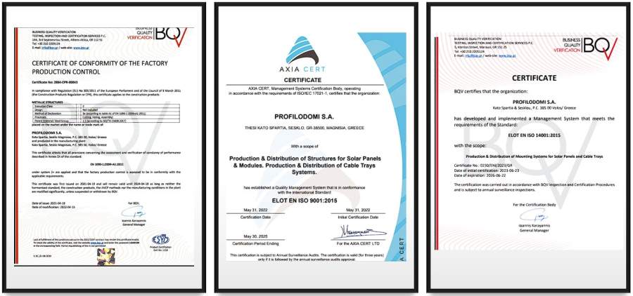 Με το Σύστημα Διαχείρισης Ποιότητας που εφαρμόζεται και βασίζεται στις απαιτήσεις του Διεθνούς Προτύπου ISO 9001:2015, το οποίο έχει πιστοποιηθεί από τον διαπιστευμένο οργανισμό εγγυάται την υψηλή ποιότητα στον σχεδιασμό και παραγωγή Βάσεων Φωτοβολταικών